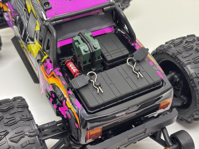 Jetzt wirds richtig schnell! Dieses kleine Brushless Monster wird mit einem 3S LiPo Akku befeuert und schafft es somit auf eine Geschwindigkeit von +/- 70 km/h! Auf Grund dieser brachialen Kraft musste das Chassis komplett neu konzipiert werden. Heraus kam dieses kleine Schmuckstück, was den Begriffen „Power & Fun“ eine völlig neue Bedeutung gibt. Um die Fahrzeugkontrolle sicher zu erlernen, kann die maximale Geschwindigkeit durch einen Drehregler begrenzt werden, bis du bereit für die volle Power bist. Die Karosserie im Race-Design ist ein echter Eye-Catcher! Dazu kommen etliche Anbauteile wie Außenspiegel, Überrollbügel, Front-Grill und einiges an Accessoires auf der Ladefläche. Dazu kommt die richtig coole „gelb leuchtende“ LED-Frontbeleuchtung. Mit all seinen orange eloxierten Aluminium-Chassis Teilen wie Dämpferbrücken, Stoßdämpfern, Motor usw. ist dieses Off-road Monster unfassbar hochwertig ausgestattet. Durch die verbauten Anti-Roll-Stabilisatoren und der Aluminium Chassis Platte hat das Fahrzeug eine fantastische Straßenlage auch bei hohen Geschwindigkeiten! Der Antriebsstrang und auch das wasserdichte Lenkservo sind mit Metallgetrieben ausgestattet und somit für eine lange Lebensdauer ausgelegt. Viele beliebte Upgrades, wie Aluminium-Öldruckdämpfer, Aluminium-Dämpferbrücken, Stahl-Antriebswellen, einstellbare Gewindestangen (vorne und hinten) sowie eine Wheelie-Bar sind bereits werksseitig verbaut. Dazu kommt eine Aluminium-Chassisplatte und Stabilisatoren (vorne und hinten) welche das Fahrzeug auch bei Höchstgeschwindigkeiten kontrolierbar machen.