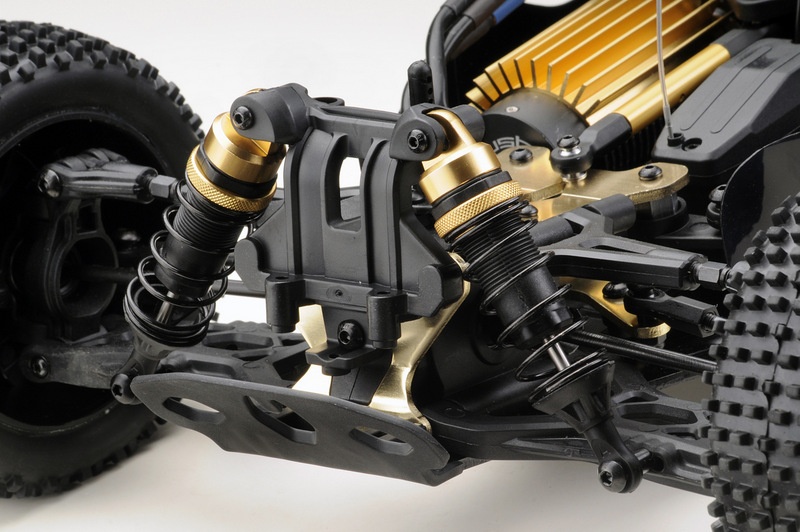 Extrem haltbare Verbund-Kunststoffteile Einstellbare 16mm "Big Bore" Stoßdämpfer Differentiale mit Vollmetal-Getriebe Downforce Race Spoiler Einstellbare Spoilerhalterung Easy-to-use" Motorbefestigungskonzept Massive CVD-Wellen vorne & hinten Mittlere Antriebswellen aus Stahl High Grip Racing Rädersatz "Saddle Pack" Batterie-Layout für eine perfekte Gewichtsverteilung 3mm Aluminium Chassiplatte mit ABSIMA Lasergravur 9kg Lenkservo mit Metallgetriebe und Aluminium Servohorn Wasser- und staubdichte Empfängerbox Vollständig kugelgelagert Chassis Seitenspritzschutz Aluminium Teile in Goldoptik veredelt