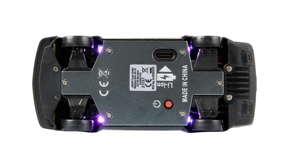 Weitere Features: RTR-Set (Ready-to-Run) inkl. Fernsteuerung, integriertem Akku und Ladekabel Störungssicheres 2,4GHz System Schaltbare LED-Beleuchtung (Unterboden) Feste LED-Beleuchtung vorne/hinten (leuchtet durchgehend immer) Lenktrimmung an der Fernsteuerung Eingebauter LiPo Akku mit 150mAh 3,7V für Fahrzeiten von bis zu 20 Minuten Eingebaute USB-C Ladebuchse zum schnellen Aufladen des Modells (ca. 30 Minuten Ladezeit) Maximale Geschwindigkeit von rund 15km/h Driftreifen (Kunststoff) und Straßenreifen (Gummi) im Lieferumfang Pylonen im Lieferumfang zum Festlegen eines Driftkurses o.ä. USB-A auf USB-C Ladekabel enthalten Unterspannungswarnung am Fahrzeug zum Schutz des Akkus 2g Micro-Lenkservo eingebaut