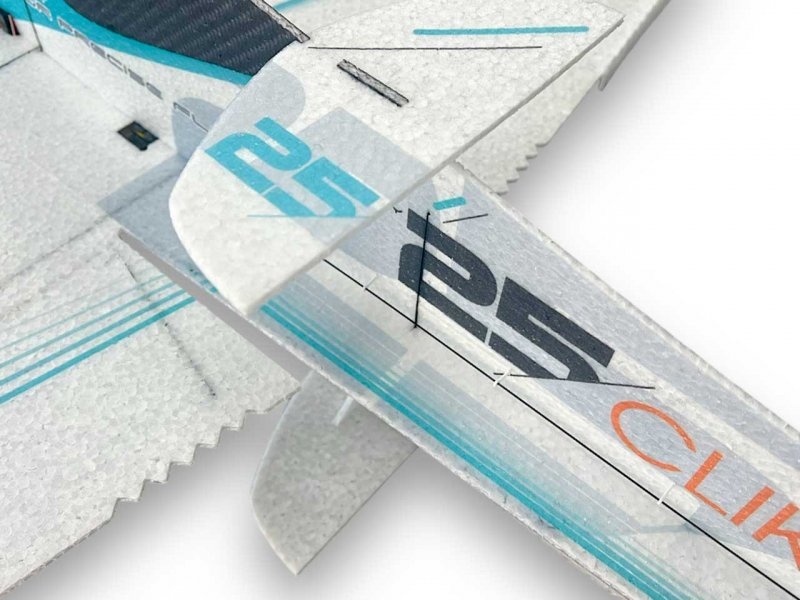 Der Clik 25 ist mittlerweile die weiterentwickelte 6. Generation des legendären Clik. Das Modell wurde komplett in EPP / Kohlefaser konstruiert und ist trotz sehr geringem Gewicht sehr robust. Die relativ rauhe Oberfläche des EPP Materials verleiht dem Modell hervorragende Langsamflugeigenschaften. Die aufgesetzten Spoiler und Diffusoren verbessern die Flugeigenschaften spürbar, wie z.B. auch das Messerflugverhalten.