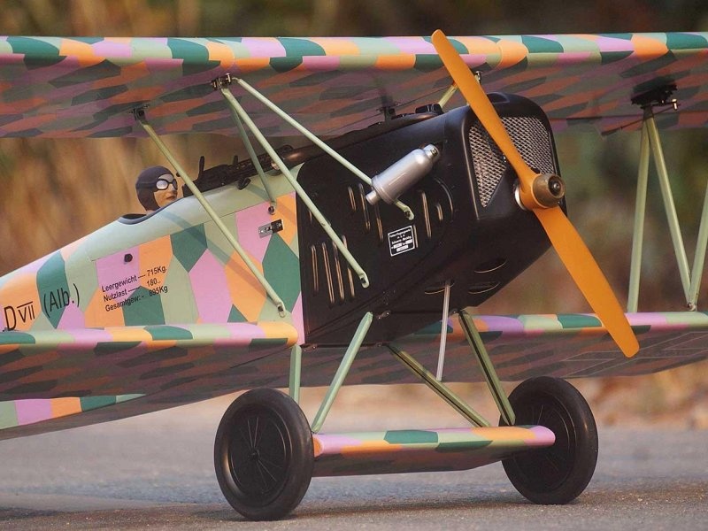 Die Fokker D7 als ARF Modell der Extraklasse. Das Modell wird serienmäßig mit viel Zubehör geliefert wie Gewehr- und Motorattrappen, Cockpitinstrument, Pilotenbüste, Scale Räder und vieles mehr. Die Fokker D7 eignet sich für 6S Elektroantriebe oder Verbrennungsmotoren mit 20cc Hubraum.