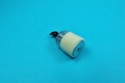 Schwerer Körper aus einer Bleilegierung, mit 3mm dickem Filzmantel. Der Filz saugt sich voll mit Benzin. So wird der Tank bis zum letzen Tropfen sicher entleert, und es gelangt keine Luftblase in den Vergaser. Dieser Filter ist für Benzinmotoren dringend zu empfehlen. Der Filz hat eine sehr große Oberfläche und eine hervorragende Filterwirkung! Er verstopft auch nach jahrelangem Einsatz nicht!