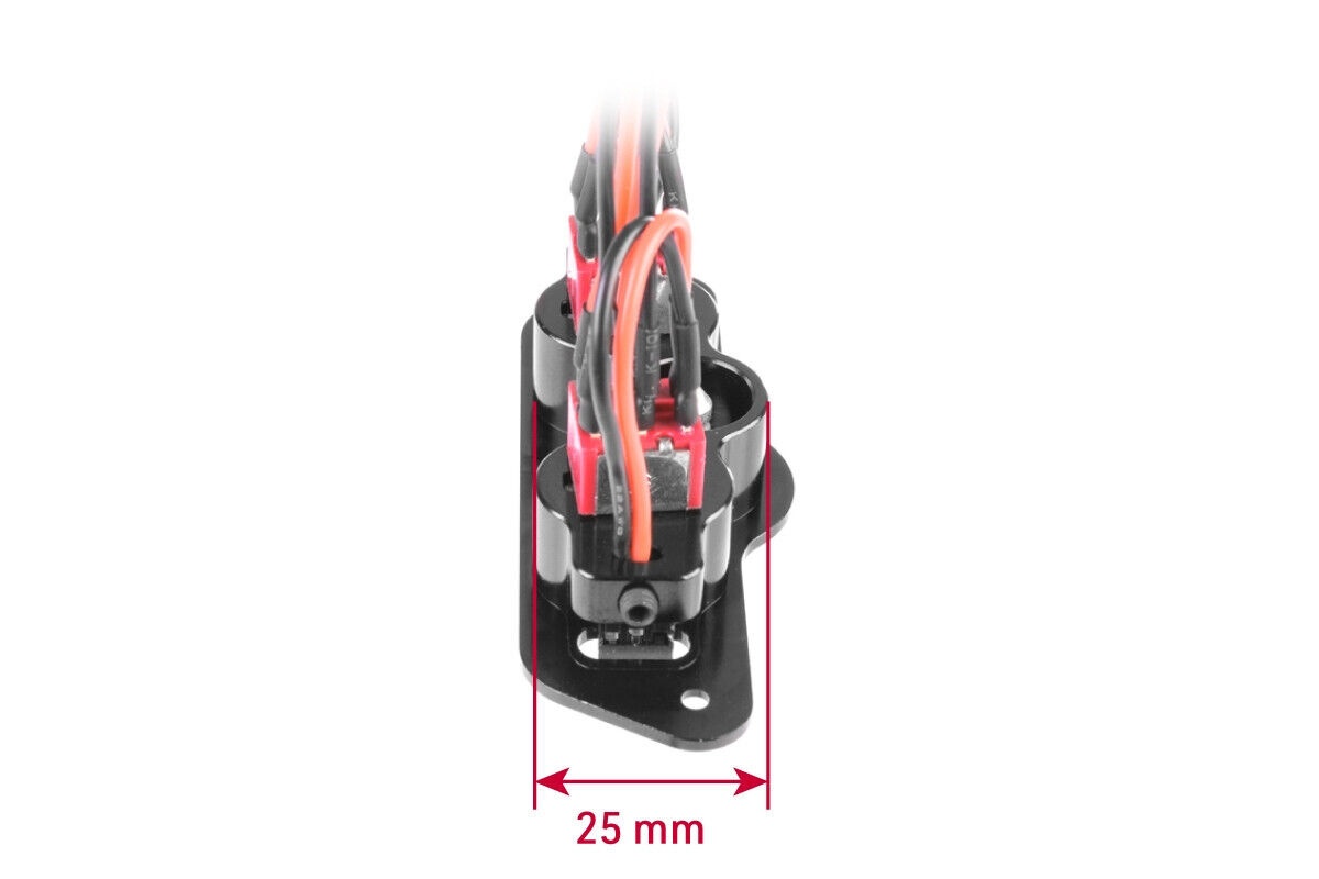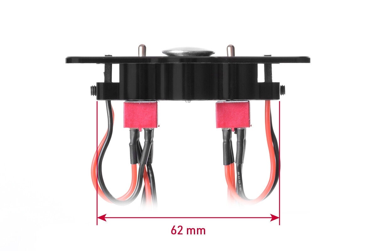 Schalter mit Tankventil! Die beiden „Rivalen“ an einem Platz. Zwei unabhängige Schalter und ein Ventil zum Tanken des Benzins, des Kraftstoffs oder eines beliebigen Rauchgemisches. Alles ist aus Aluminium gefertigt, dies garantiert geringes Gewicht und Qualität, die wir brauchen. Die Stecker sind kompatibel mit JR und Futaba. Das Gewicht inklusive Kabeln ist 58 g. Die Kabellänge ist 22 cm. Andere Maße und notwendige Daten für die Installation sehen Sie auf dem Foto.