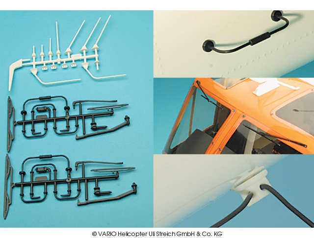 Der Scale-Anbausatz beinhaltet die gebräuchlichsten Anbauteile von Großhubschraubern, damit Sie Ihren Modellhubschrauber wirklich naturgetreu nachbauen können. Zum Scale-Anbausatz gehören Scheibenwischer, Türgriffe, Antennen, Staurohre, Wärmefühler usw., zwei Steuerknüppel sind auch dabei. Mit zwei Aluröhrchen, die Sie passend zurechtbiegen (siehe Biegewerkzeug Ord.No. 11/80), setzen Sie die Steuerknüppel ins Cockpit ein. Die Scheibenwischer erwärmen Sie mit einem starken Föhn, um die Passung für eine spezielle Fensterkontur nachzuformen.