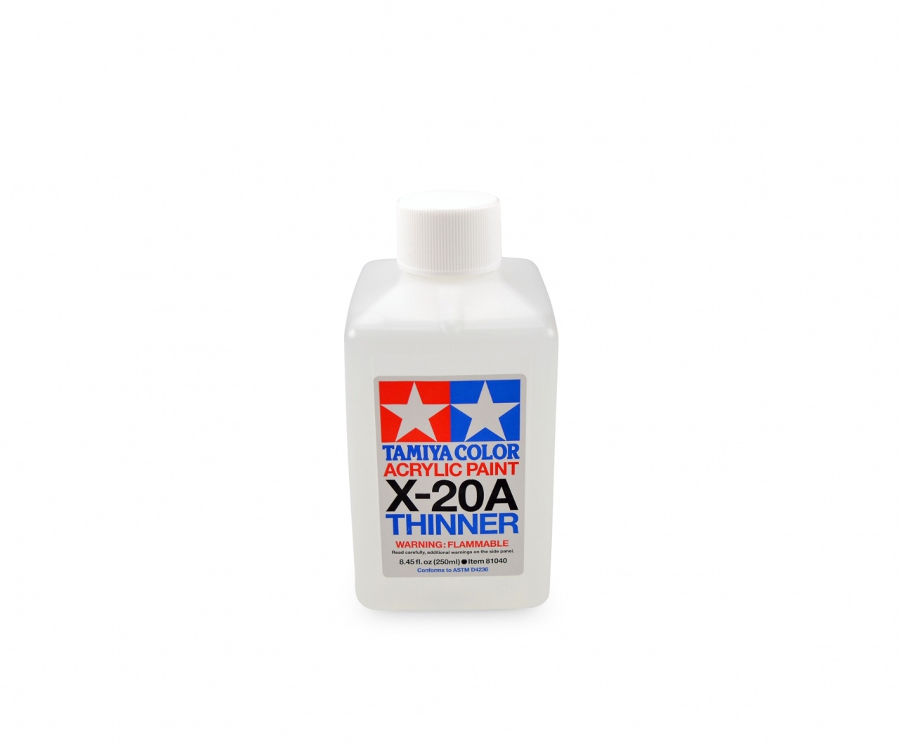TAMIYA X-20A Acryl-Verdünner ist die perfekte Wahl zum Verdünnen der TAMIYA Acrylfarben. Die Rezeptur ist so gewählt, dass die TAMIYA Acrylfarben nach dem Farbauftrag und Abtrocknen nicht verblassen oder fleckig werden. Des Weiteren ist der Verdünner auch für die Reinigung von Airbrushsprühgeräten (Farbbecher, Nadeln und Düsen) und Pinseln (Bei Naturhaarpinseln, nach der Reinigung zur Pflege den Brush Conditioner (300087181) verwenden) bestens geeignet. Bei der Verarbeitung mit Airbrushsprühgeräten (je nach verwendeter Düse 0,25 - 0,50mm) ist ein Mischverhältnis 1:2 – 1:3 (1 Teil Farbe : 2 oder 3 Teile Verdünner) ideal.