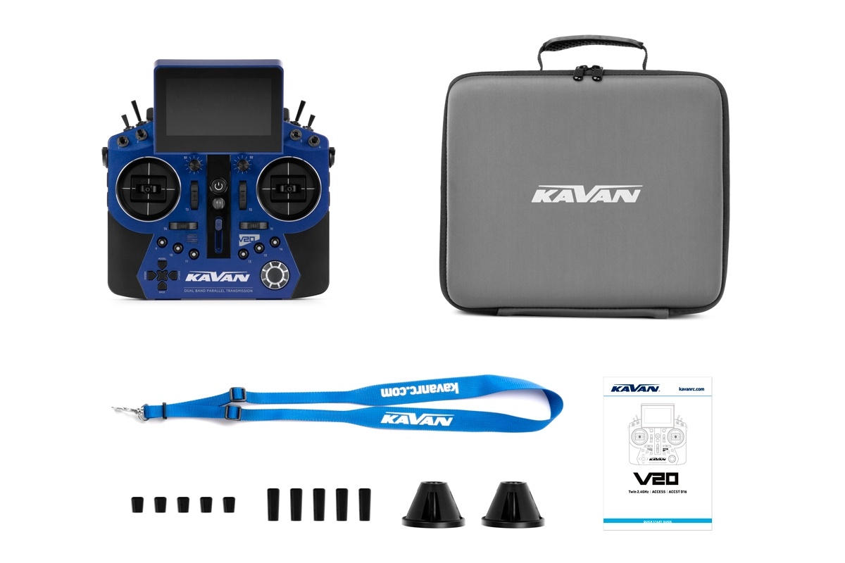 Sender KAVAN V20 - blau Fortgeschrittenes 24-Kanal-RC-Set Twin 2.4GHz/ACCST D16/ACCESS. Ergonomisches, robustes Gehäuse, präzise Kreuzknüppel mit Hall-Sensoren. Volle Telemetrieunterstützung, großes Farb-Touch-Display mit intuitiver Benutzerschnittstelle. ETHOS™ Betriebssystem. Umfangreiche Auswahl an Funktionen und Mixern für alle Typen von RC-Modellen. Unterstützung für Telemetrie-Empfänger mit klassischen PWM- und S.BUS-Ausgängen.