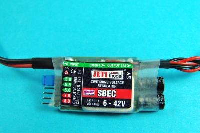 Der Schaltspannungsregler SBEC soll als Stromversorger für Empfänger und Servos dienen. Er macht es möglich, eine breite Palette von Eingangsspannungen von 2S bis zu 10S Li-XX Zellen zu verwenden. Der Aufbau der Ausgangsspannung zwischen 5 und 8 V wird durch einen Jumper bewerkstelligt. Dies Bedeutet, dass der SBEC auch zur Verwendung für die Sevos mit "höheren" Spannung geeignet ist. Der SBEC ist aufgrund seiner maximalen Spannung von bis zu 12A für mittlere und größere Modelle geeignet.