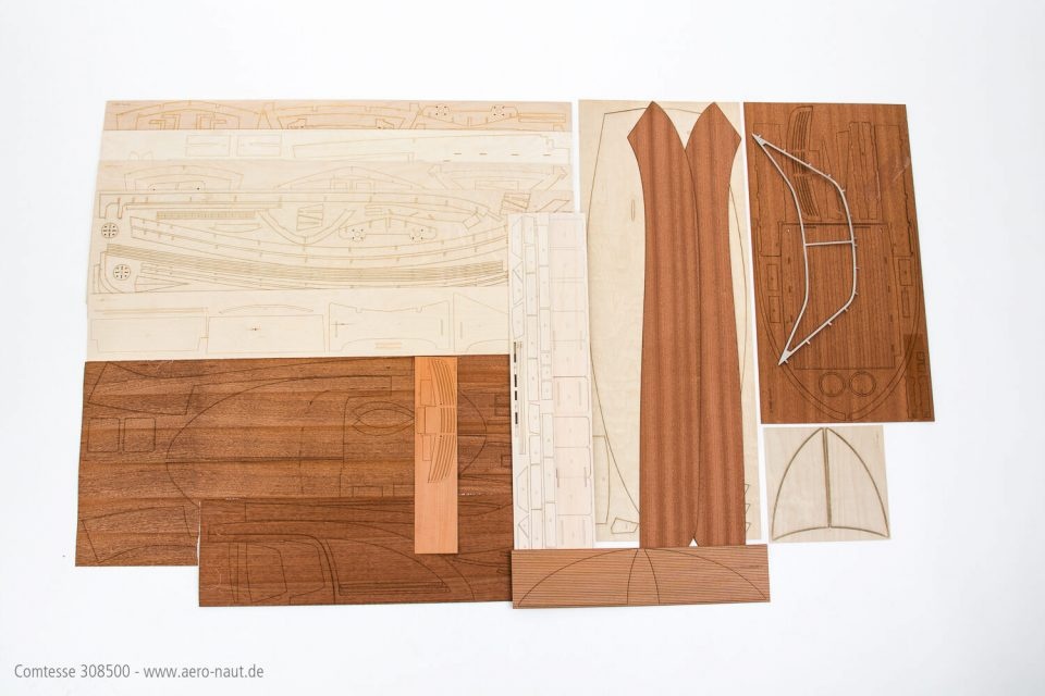 Der Modellbausatz enthält sämtliche präzise geschnittenen Holzteile, viel edles Mahagonifurnier, Kunstleder, Armaturen, Zuschnitte, Ätzteile aus Neusilber, ausführliche Bauanleitung mit 3DBaustufenzeichnungen,Bauhelling.