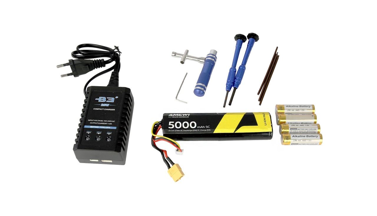 Lieferumfang: Modell Fernsteuerung Akku Ladegerät Anbauteile Aufkleber Bogen Werkzeug Batterien für die Fernsteuerung Anleitung DE/EN