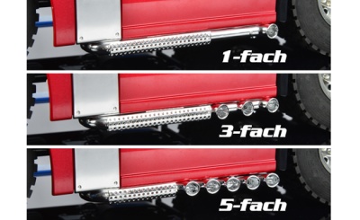 Das verchromte CARSON-Abgasanlagenset Euro-Style im Maßstab 1:14 verleiht Trucks einen coolen Look. Die mächtigen Side Pipes lassen sich 1-, 3- oder 3-flutig bauen.